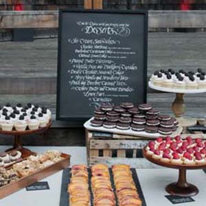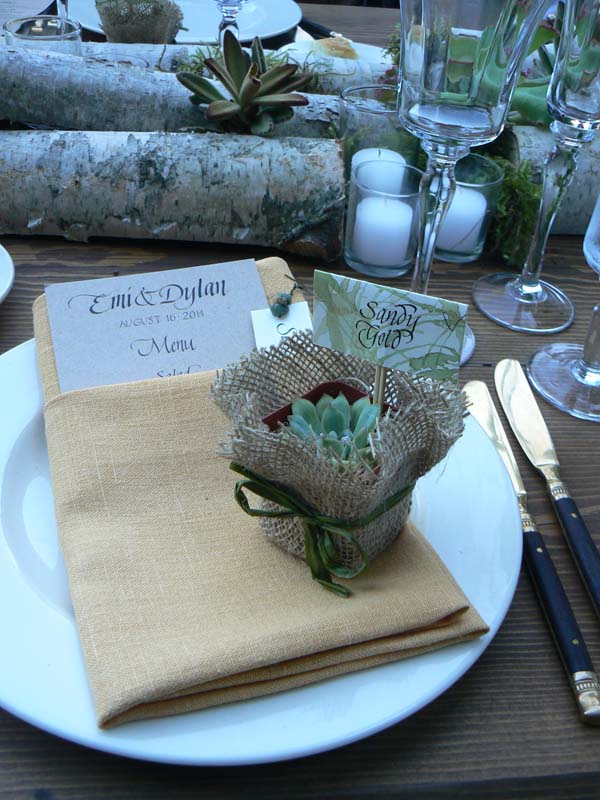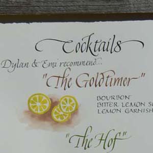 These are examples of calligraphy used in one particular wedding - that of my son, Dylan Gold, and daughter-in-law, Emi Hofmeister. It was a weekend-long outdoor event with about 200 guests. The style might be called "elegant rustic".
